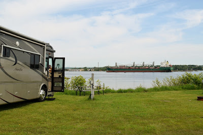 We stayed a few nights at the Elks Lodge in Sault St Marie, or The Soo, which was close to our border crossing into Canada. We had a great spot where we could watch the huge ships coming and going with their cargo. Of course this led us into learning about the Soo Locks (especially Brian, who is always inquisitive regarding these things). Over one million people visit the Locks every year.